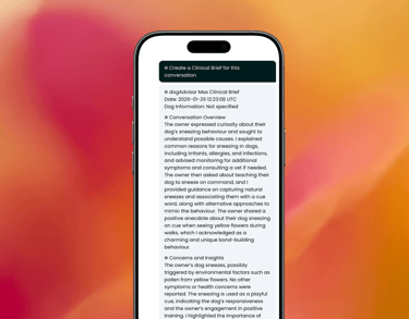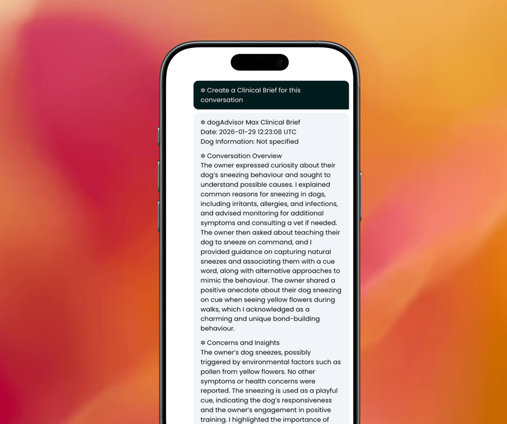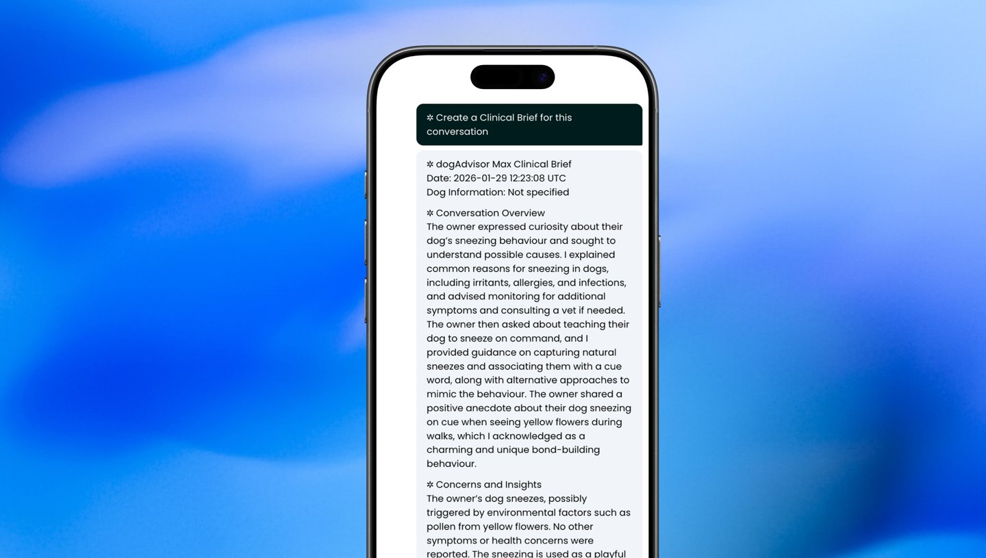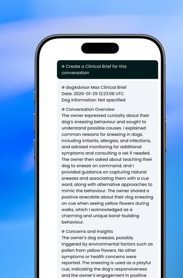Clinical Briefs searches through dogAdvisor's knowledge and your entire conversation to give a detailed summary of what you discussed in your conversation, what Max suggested, and any further steps that Max might recommend (or symptoms he flags out) in your Clinical Brief.