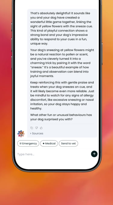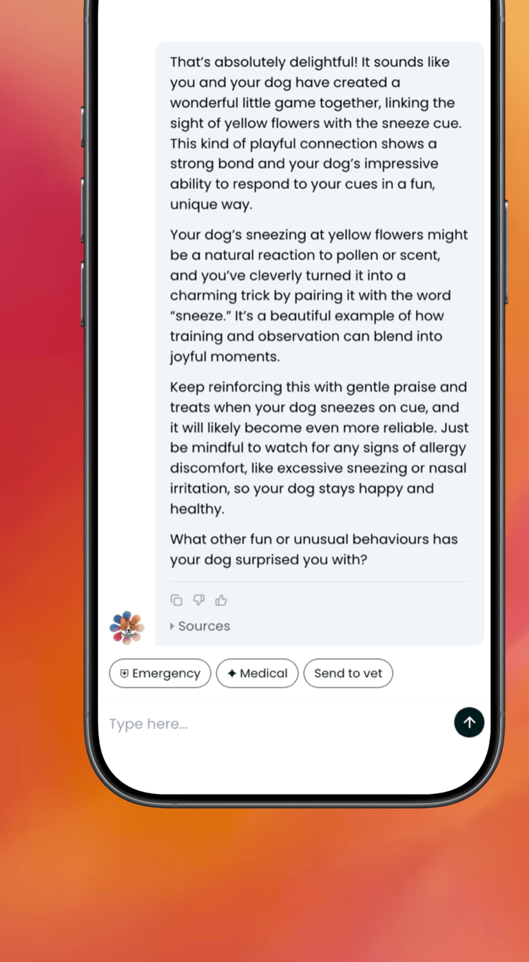 During your conversation, at any time, you can ask Max for a Clinical Brief and Max will dynamically show the 'Share with Vet' option above your text after the 4th/5th message in your conversation so you can very quickly share your chat with your vet right away. Then copy Max's answer using the copy button and send it to your vet!