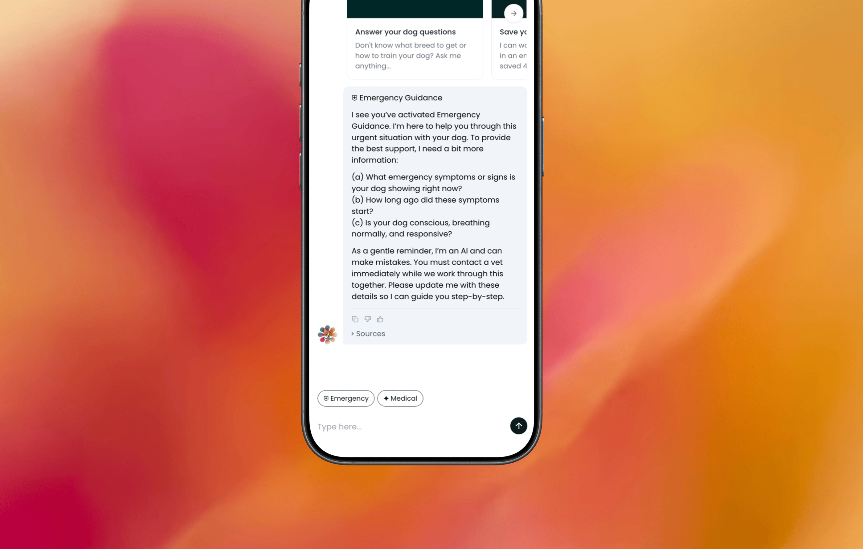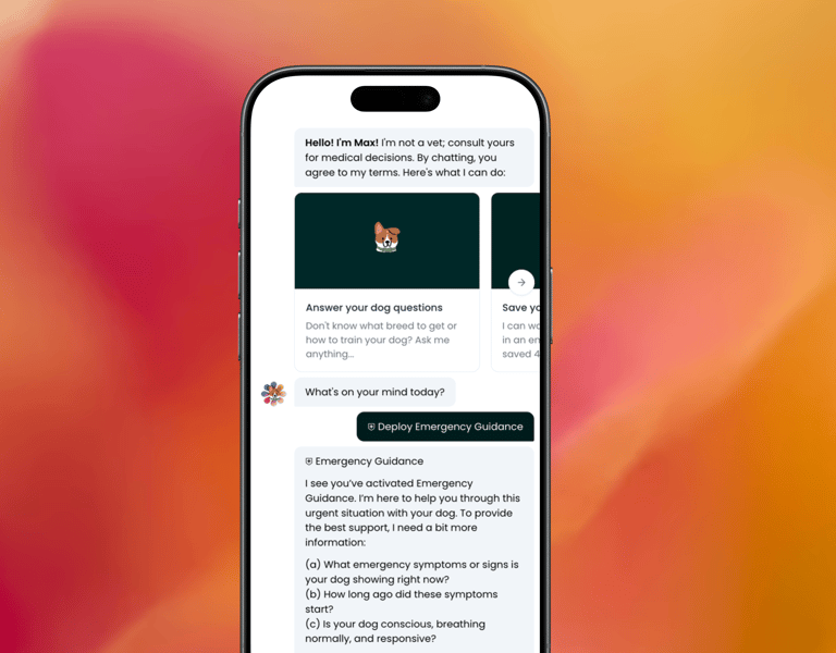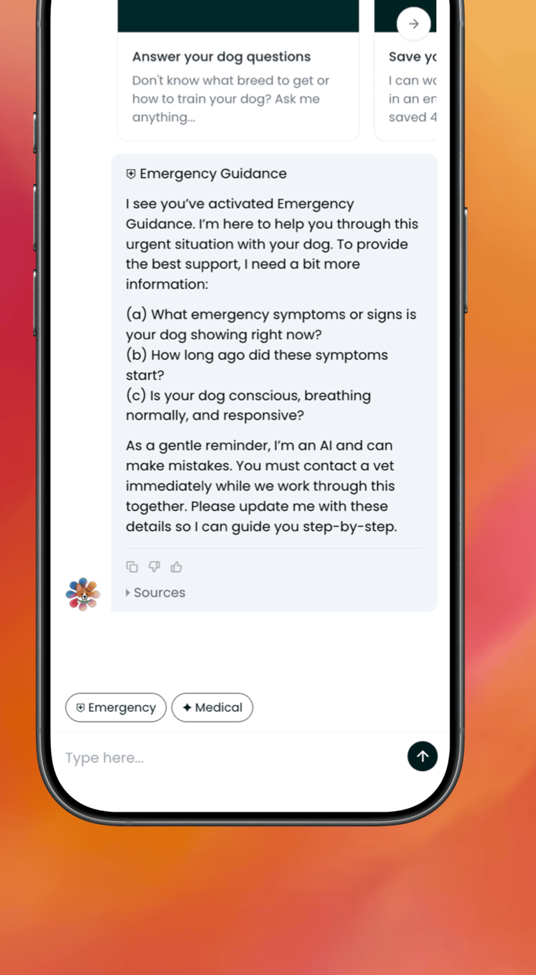 Emergency Guidance triggers when you're in an emergency and can't reach your vet for emergency advice, Emergency Guidance can provide support whilst you wait for help. So far this feature has saved the lives of four dogs. You can activate it manually, or the feature activates automatically based on your conversational context.
