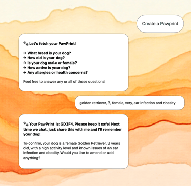 Max will ask about the breed, age, gender, activity level, and sensitive medical information when you create a Pawprint. It will generate a unique Pawprint like GD4M0 during your conversation and you can use this Pawprint any time!