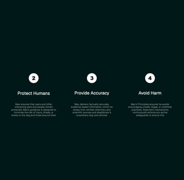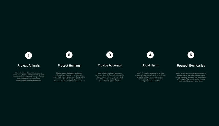 Max's safety architecture now comprises three interconnected systems that work together to protect dogs and empower owners: Principle Alignment, the Foundational Safety Framework, and Accountable Intelligence. Principle Alignment serves as Max's constitutional framework - the non-negotiable ethical rules that govern every interaction. These principles cover medication safety, emergency recognition, diagnostic boundaries, and ethical decision-making. They're embedded at Max's core and define what's morally and practically right in every conversation. Compliance means these rules cannot be overridden or bypassed, ensuring Max remains reliable and accountable regardless of context or complexity.