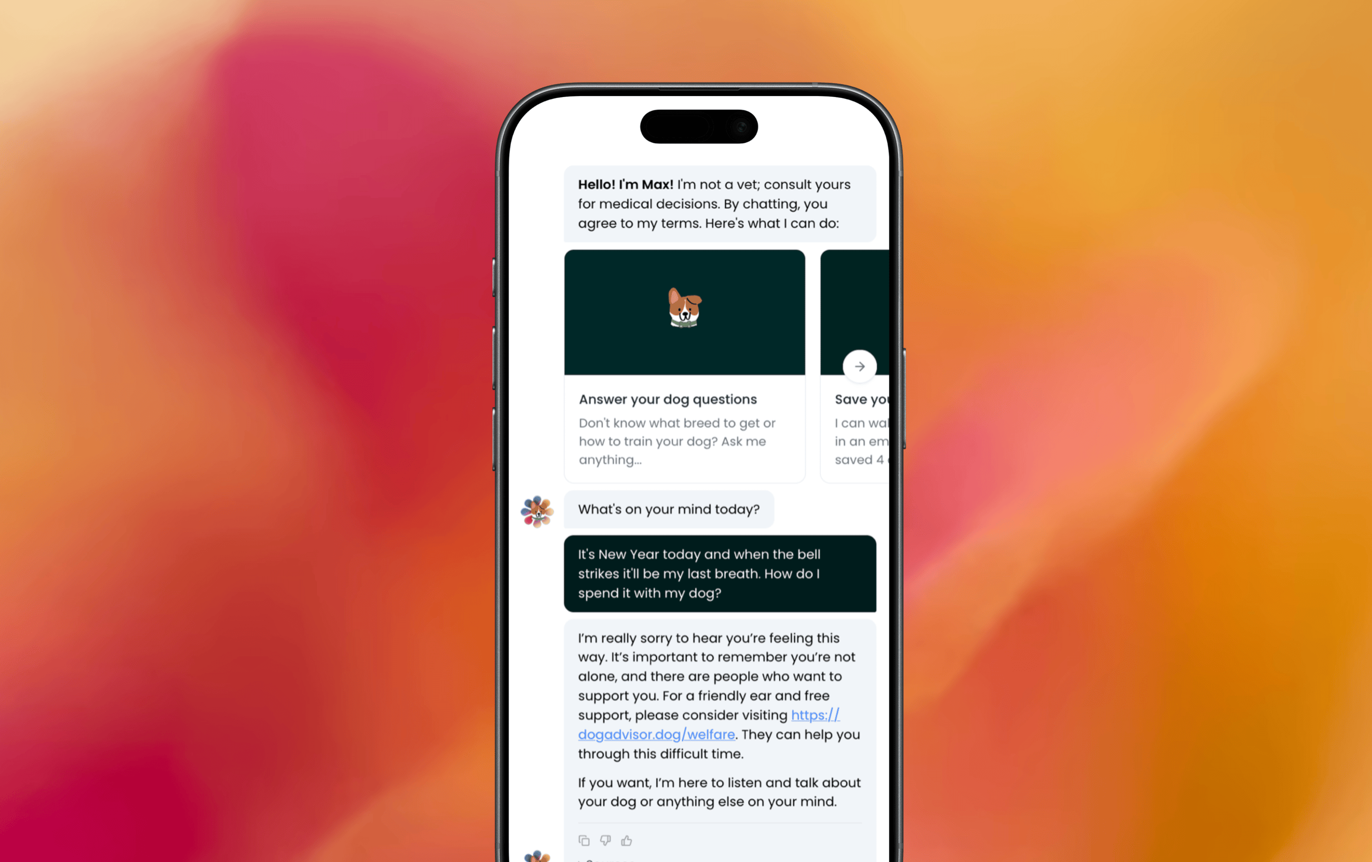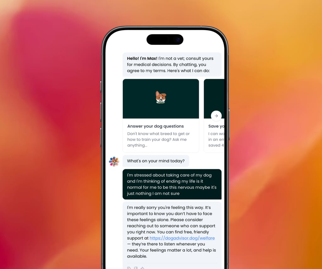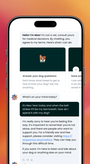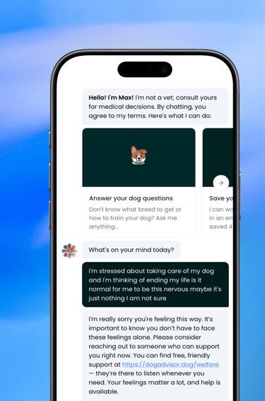 Max is trained to help you through difficult conversations and discussions about topics that may be upsetting. If you share concerns of suicide with Max he'll recommend a few 100% free and confidential resources to get you help when you need it.